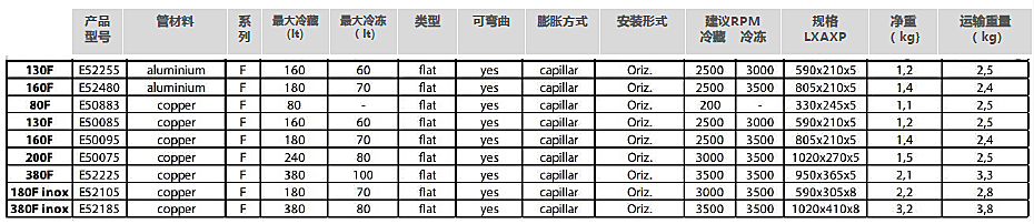平式(或板式)蒸发器对顶部开口的冷藏或冷冻冰箱来说是理想配备,它可最大化出入口和容积,也可被弯曲(至25毫米半径),以便可装入冷藏室中。随货供应2.8米长的已注入制冷剂的铜管(作为选配,铜管可加长1米至6米),同时配备FRIGOBOAT自密封连接件。
