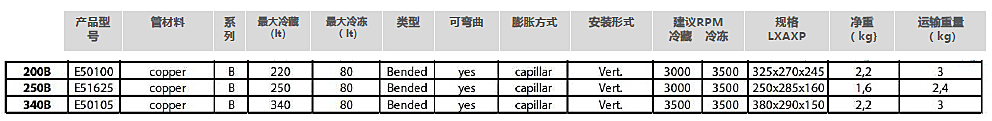 所有FRIGOBOAT B 系列的蒸发器用于带冷冻室的冰箱或专用冷冻冰箱,可水平或垂直安装,随货供应2.8米长的已注入制冷剂的铜管(作为选配,铜管可加长1米至6米),同时配备FRIGOBOAT自密封式连接件。