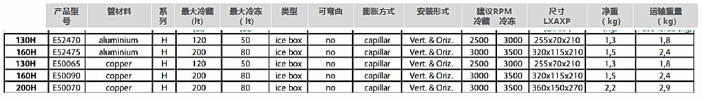 蒸发器H系列可用于冷冻冰箱,可垂直或水平安装,需水平安装时,会配备一个遮盖口,随货供应2.8米的已注入制冷剂的铜管(作为选配,铜管可加长1米至6米),同时配备FRIGOBOAT自密封式连接件。